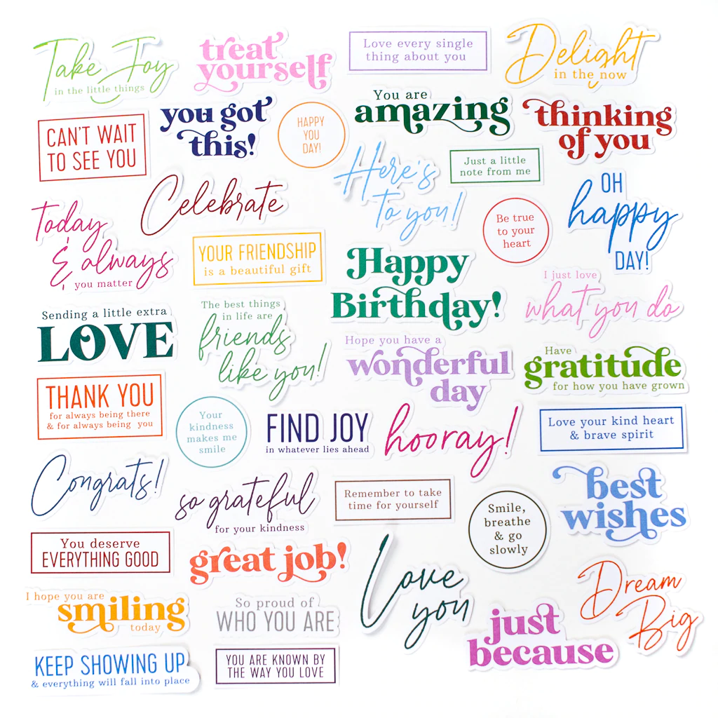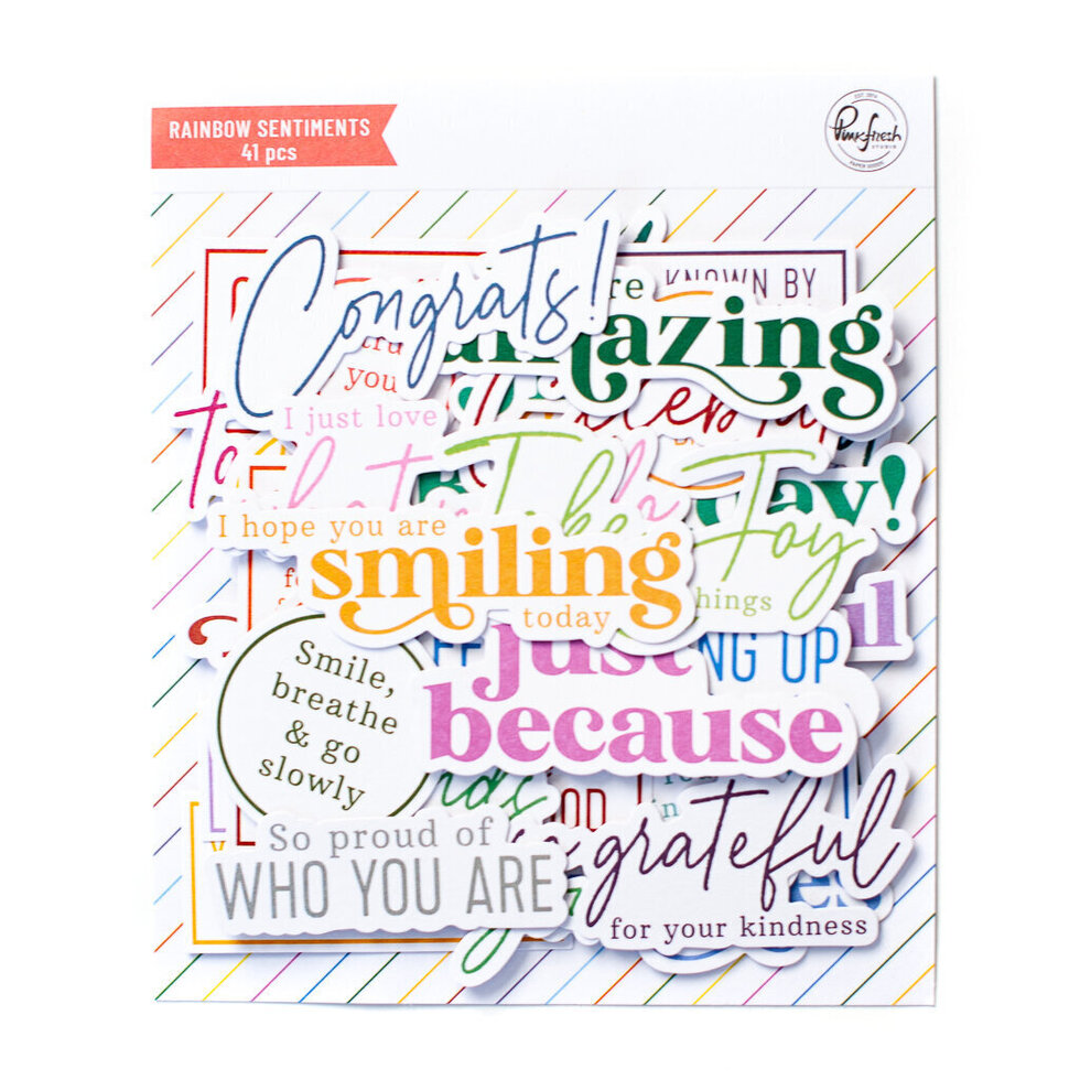 41 pc. diecut ephemera pack of rainbow colored foiled sentiments. There are sentiments for many occasions, including birthday, love, congratulations, thank you and more! This diecut pack is perfect for crafters who want to add a foiled sentiment to their project, but don't have a foiling machine. The sentiments include a range of script, modern and serif fonts that crafters have come to expect from Pinkfresh Studio