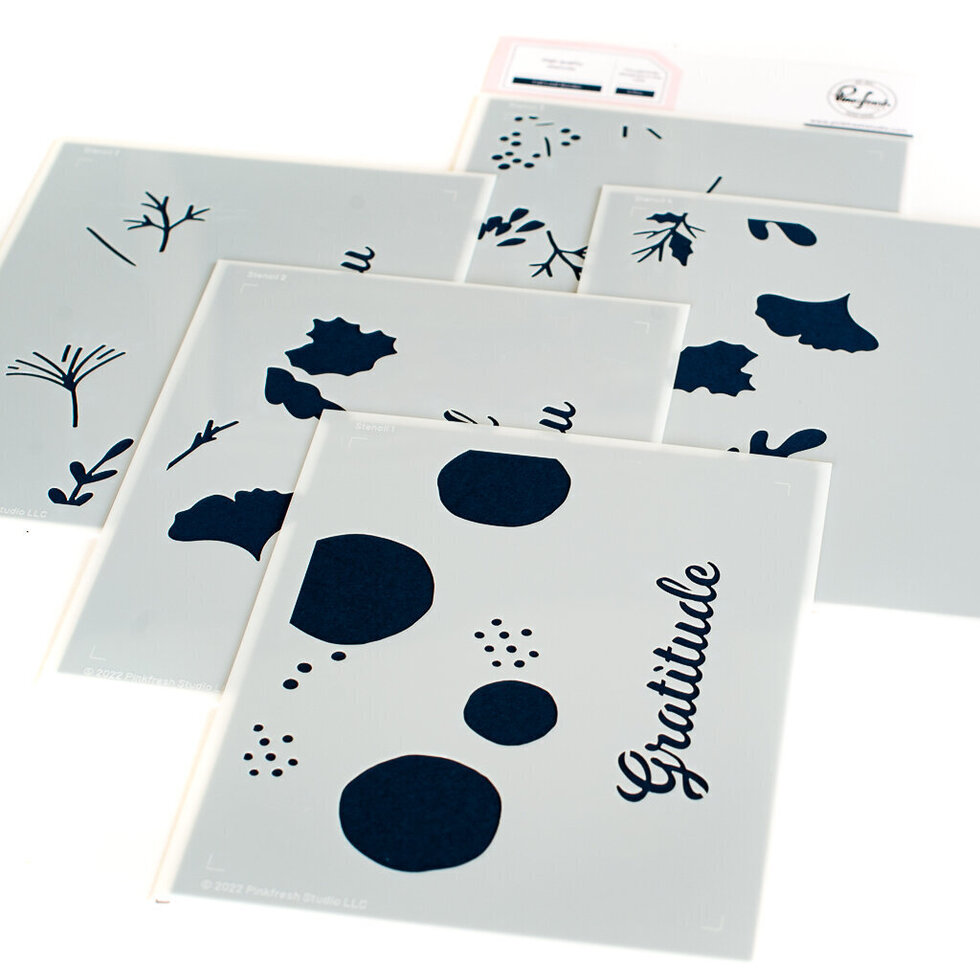 5 piece layering stencil set designed by Inna Moreva. Made to coordinate with the Fall Leaf Border Sentiments die set. This beautiful leafy border fits perfectly along the edge of an A2 sized card base. With a stencil for every layer and guidelines for perfect alignment, easily build up this whimsical border by ink blending with our 48 shades of premium dye ink. Add dimension to a layer with texture or glitter paste, or add some shine with embossing ink & powder. We've included three additional sentiments within the stencil set, including "Gratitude", "Thank you", and "Grateful for You". These are meant to be ink blended or carefully heat embossed, then you have the option to cut them out with the coordinating die set. Stencil design measures approximately 4.25" x 5.5"