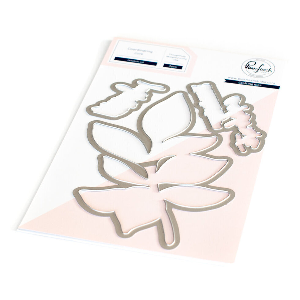 3 pc die set to coordinate with the Detailed Leaf stamp set, Detailed Leaf hot foil plate and Detailed Leaf layering stencil set. This die set cuts around the leaf image, leaving a thin border around the image. There are also two dies to cut out the celebrate and beautiful sentiments. Approximate Measurements: Leaf 3" x 5", Celebrate sentiment 1" x 2.75", Beautiful sentiment 1" x 1.75"