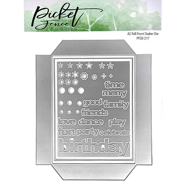 Steel Die set from our Stand Alone Die Collection. Die size 6.16" x 7.47". Total of 3 dies, Cuts 27 Shapes and includes 12 Words. A2 Full Front Shaker Die with four scoring lines and four cutting edges. Rectangle die to secure protection against shaker pieces falling out. Rectangle die which cuts 25 shaker shapes and 12 words.