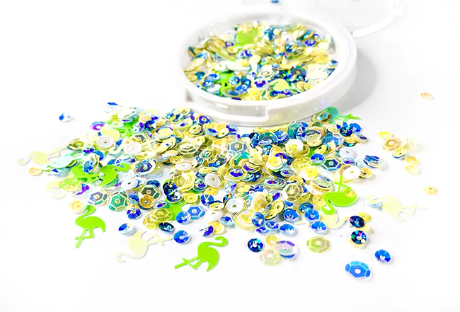 You can never have too much sparkle! Add the perfect finishing touches to your crafty projects with Picket Fence Studios' exclusive, custom mixed sequin collection. Our gorgeous, unique embellishments come in beautiful compact cases with clear lids - ready to store and use as soon as they arrive, and they even let you peek in from the side to grab the mix you want easily from a stack. The lids are flat, so the containers can be stacked on a shelf or in a drawer. These sparkling sequins range from 3-6 mm within the mixes, and even with the attractive storage are priced beautifully as well. 1 Tablespoon