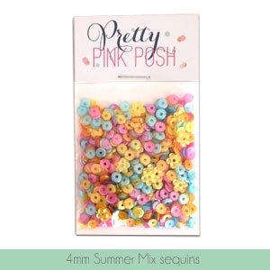 Add a touch of glitz and glam to your craft projects with this beautiful batch of 4mm Summer Mix (Aquamarine, Pink Peonies, Lemon Drop and Marigold) sequins, along with some small yellow flower sequins! These are the perfect embellishment for your cards, scrapbook pages, gift wrapping or paper crafts. Each pack contains 1.5 teaspoons (approximately 500) of 4mm size sequins.