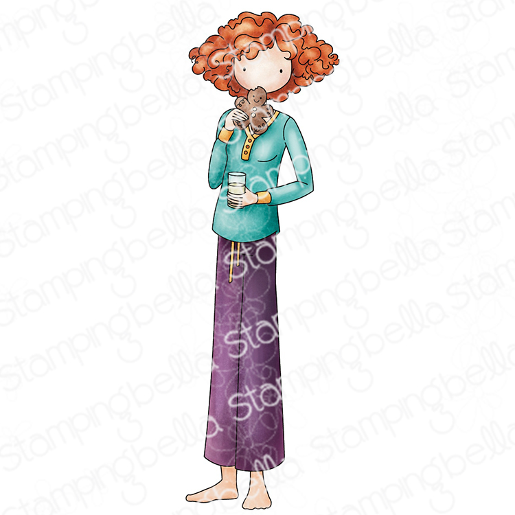 This stamp features a cozy Uptown Girl enjoying a quiet moment of seasonal indulgence, and the warmth of holiday traditions. Curly-haired and barefoot, the character holds a glass of milk in one hand and a gingerbread cookie in the other, clearly savoring the simple pleasures of holiday treats. Her relaxed pose and serene expression suggest a sense of warmth, comfort, and contentment-perfect for celebrating the joy of festive rituals . Approx Size: 1.3" x 4.25"