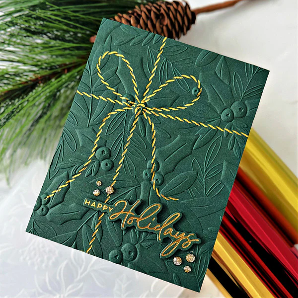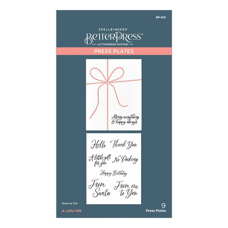 A Little Gift Press Plate is part of the Dancin' Christmas Friends Collection. This wonderful set of nine press plates can gift wrap any A2 size card front with a sweet twine bow. There is a choice of eight handwritten sentiment choices to finish it off. Ink the plates with the BetterPress Ink to be pressed against the BetterPress Cotton Card Panel and Sheets for a crisp letterpress design.