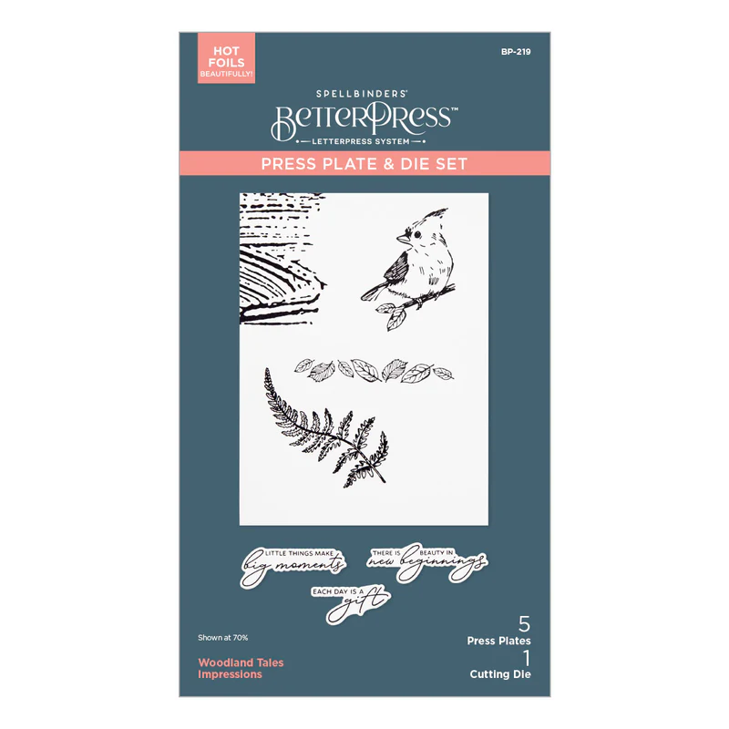 Woodland Tales Impressions Press Plate & Die Set is part of the Woodland Tales Collection. Natural elements such as a bird, texture pattern, fern and leaves are included in this set of five press plates and one thin metal cutting die. A press plate with four sentiments and a coordinating die to cut all at once complete this offering. Ink the plates with the BetterPress Ink to be pressed against the BetterPress Cotton Card Panel and Sheets for a crisp letterpress design.