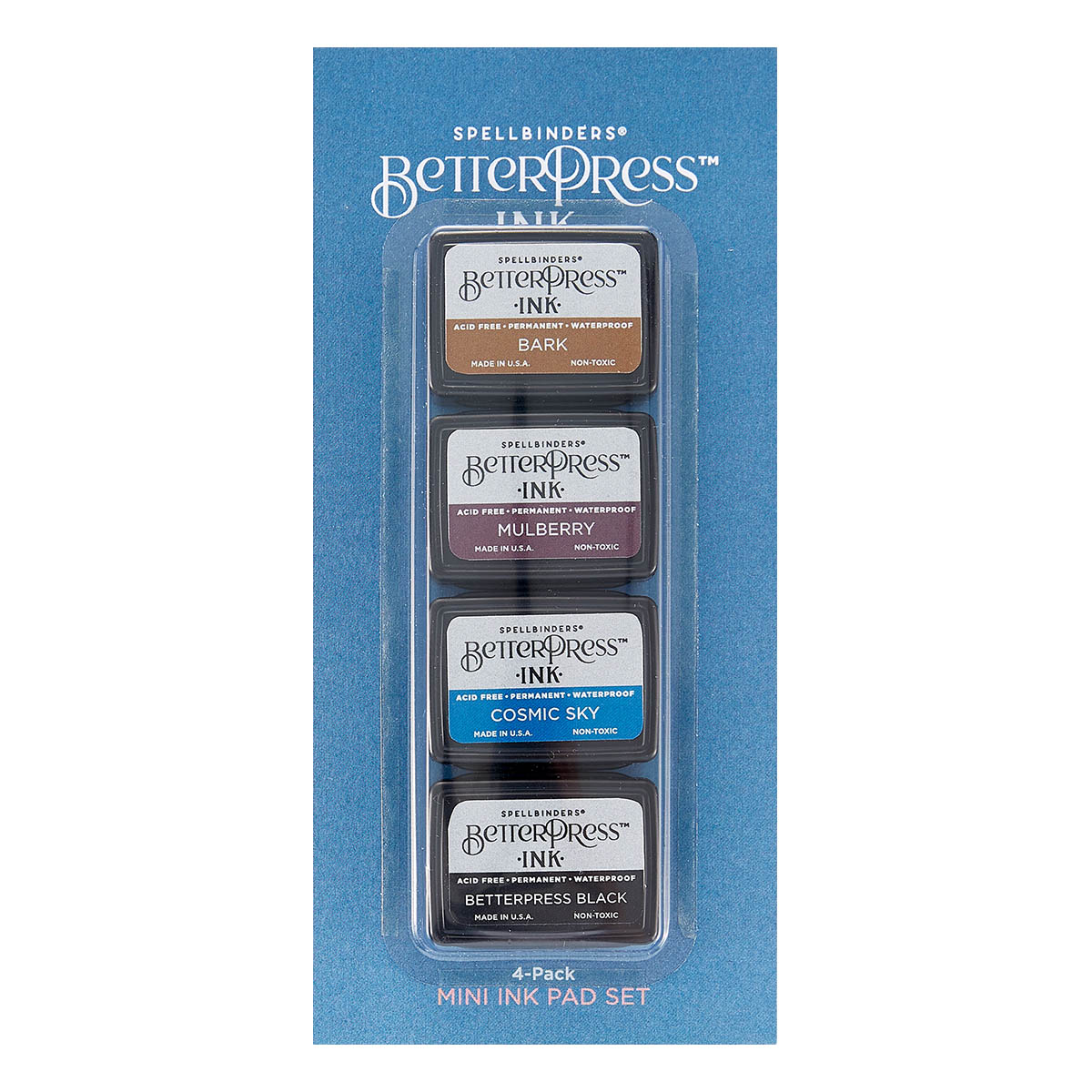 BetterPress Ink Regal Tones Mini 4-Pack Set includes four 1.25 x 1.75-inch ink pad colors of Bark, Mulberry, Cosmic Sky, and BetterPress Black. These inks are specially formulated Ranger Archival Ink made for the BetterPress Letterpress System. They are acid free, permanent, and waterproof. Follow the BetterPress Letterpress System instructions to create beautiful and detailed letterpress effects with these inks. Reink only with BetterPress Ink Reinkers (sold separately). Clean inked press plate with Ranger Archival Ink Cleaner.