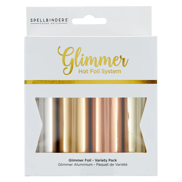 Glimmer Hot Foil 4 Rolls - Satin Metallics Variety Pack comes in four different colors. Each roll is 15-foot with a width of 5-inches. Colors include Satin Pewter, Satin Gold, Satin Rose Gold, and Satin Champagne. Glimmer Hot Foil Foils add stunning and eye-catching foil designs to any project from paper crafts to mixed media and more! The foils are exclusively designed to be used with the Spellbinders Glimmer Hot Foil System. The foils are designed to work with the Glimmer Hot Foil System and is NOT compatible with laminating systems such as the Minc System. Approximate size: 5 inches x 15 feet/12.70 cm x 4.572 meters