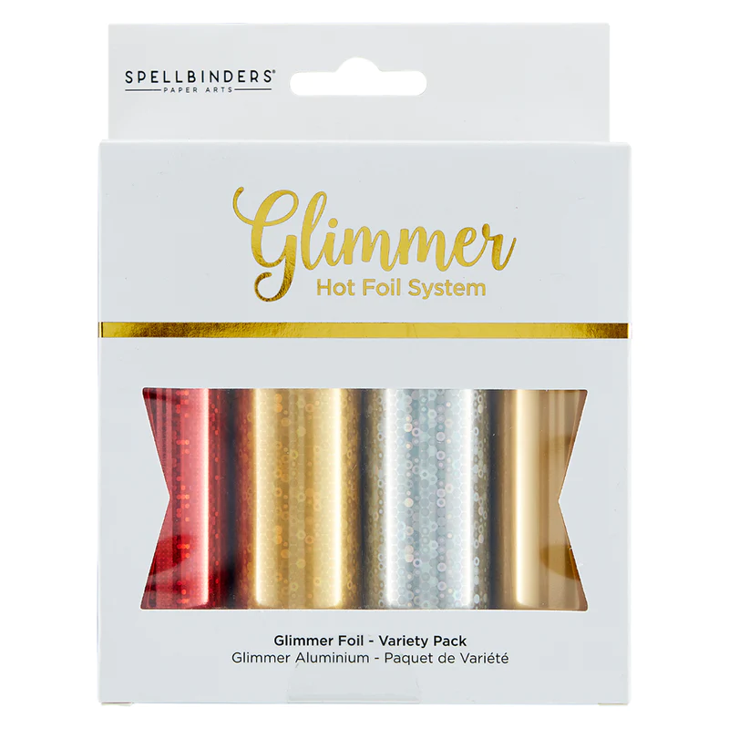 Glimmer Hot Foil 4 Rolls - Christmas Sparkle Variety Pack comes in four different colors. Each roll is 15-foot with a width of 5-inches. Colors include Sparkle Red, Sparkle Gold, Sparkle Silver, and Satin Gold. Glimmer Hot Foil Foils add stunning and eye-catching foil designs to any project from paper crafts to mixed media and more! The foils are exclusively designed to be used with the Spellbinders Glimmer Hot Foil System. The foils are designed to work with the Glimmer Hot Foil System and is NOT compatible with laminating systems such as the Minc System. Approximate size: 5 inches x 15 feet/12.70 cm x 4.572 meters