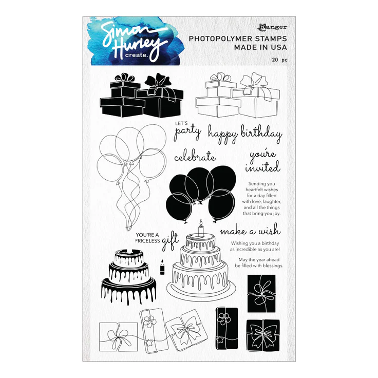 Ranger Birthday Party Clear Stamp Set by Simon Hurley has a set of twenty clear stamps perfect for celebrating all the birthdays in your life! It includes layering stamps of a towering birthday cake with colorful dripping frosting, a bright bouquet of balloons and multiple stacks of gifts. Also includes nine sentiments for just the right message. So fun! Coordinates with S5-640 Birthday Party Etched Dies to perfectly cut out all the images.