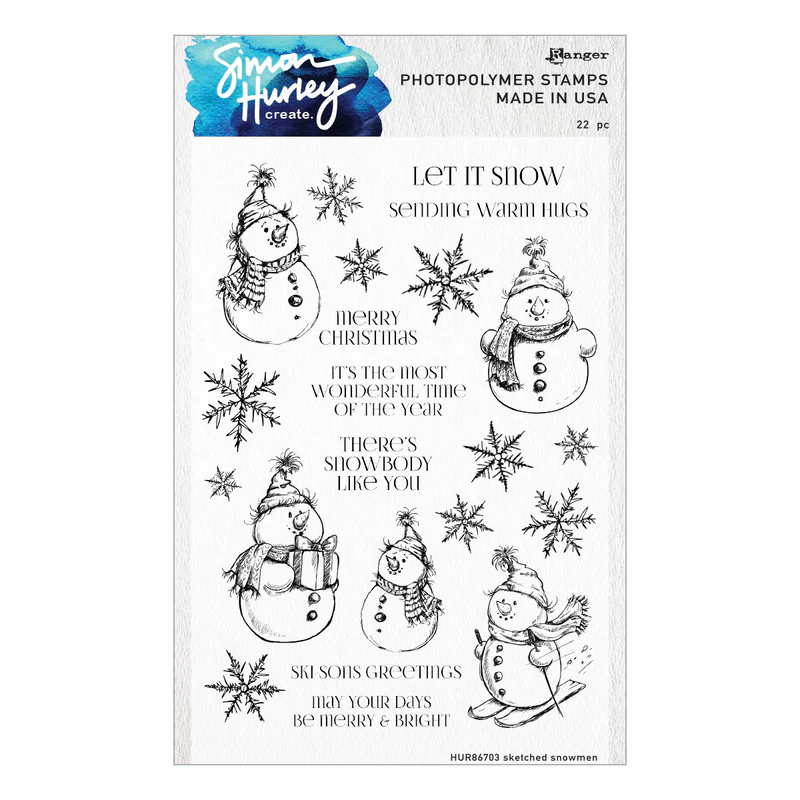 Ranger Sketched Snowmen Clear Stamp Set by Simon Hurley create is a set of twenty-two stamps that make friendly snowmen in a playful, hand-drawn style. With four different snowmen and an array of unique snowflakes, this set is perfect for creating snowy winter scenes on all your holiday projects. Combine with the coordinating dies in S6-242 Sketched Snowmen Etched Dies create adorable dimensional elements to adorn cards, scrapbook pages and more.