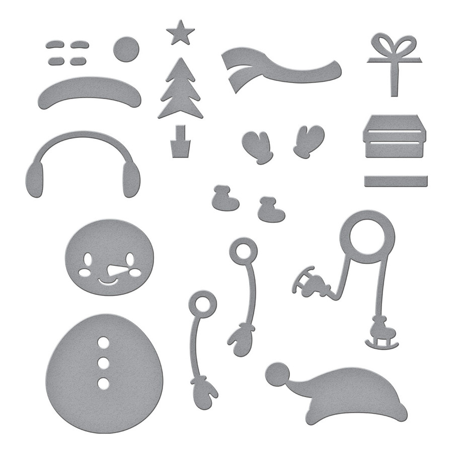 Dancin' Snowman Etched Dies is from the Tinsel Time Collection with a set of 13 thin metal cutting dies. Make a sweet snowman who loves to skate and dance (snip off the blades)! Yes, it has moving legs - so cute. The set includes lots of fun accessories from winter gear, a small tree to a gift. The assembled snowman measures 2.55 x 3.24 in./6.50 x 8.20 cm. Make more to do a line skate/dance or add partners like S3-449 Dancin' Deer and S4-1196 Dancin' St. Nick. Approximate Size: Hat: 1.57 x 0.70 in./4.00 x 1.80 cm, Hat Pom Pom: 0.29 x 0.29 in./0.70 x 0.70 cm, Hat Band: 1.14 x 0.37 in./3.00 x 0.90 cm, Head: 0.98 x 0.85 in./2.50 x 2.20 cm, Ear Muff: 1.27 x 0.75 in./3.20 x 1.90 cm, Body: 1.30 x 1.30 in./3.30 x 3.30 cm, Scarf: 1.30 x 0.51 in./3.30 x 1.30 cm, Arm (2 pcs): 0.43 x 1.32 in./1.10 x 3.30 cm, Mitten (2 pcs): 0.30 x 0.41 in./0.80 x 1.00 cm, Mitten Cuff Layer (2 pcs): 0.21 x 0.09 in./0.50 x 0.20 cm, Skating Legs: 1.53 x 1.23 in./3.90 x 3.10 cm, Skate Boot Layer (2 pcs): 0.31 x 0.29 in./0.80 x 0.70 cm, Skate Book Cuff Layer (2 pcs): 0.18 x 0.10 in./0.50 x 0.30 cm, Tree: 0.51 x 0.89 in./1.30 x 2.03 cm, Tree Star Layer: 0.32 x 0.28 in./0.80 x 0.70 cm, Tree Trunk: 0.23 x 0.36 in./0.60 x 0.90 cm, Gift Box Base: 0.70 x 0.48 in./1.80 x 1.20 cm, zift Box Top: 0.71 x 0.22 in./1.80 x 0.60 cm, Gift Box Ribbon: 0.71 x 0.62 in./1.80 x 1.60 cm