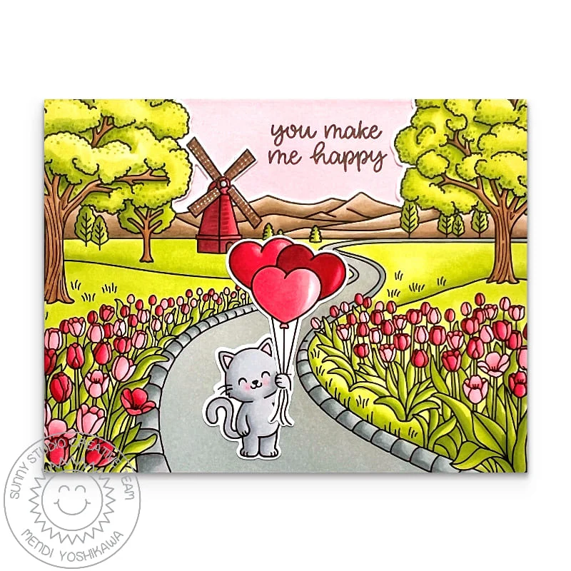 Take a delightful stroll down a tulip-lined lane with our Tulip Path Background Stamps! This 6x6 spring-themed backdrop showcases a picturesque pathway bordered by vibrant tulips, leading to a charming windmill in the distance. Individual clouds and playful bunnies add an extra layer of whimsy, perfect for enhancing your designs. Whether you're crafting a serene springtime card or using the additional elements separately, this set provides everything you need to infuse your projects with the beauty of the outdoors! Approximate Stamp dimensions: Tulips with Large Tree in Meadow Scene- 5-5/8"w x 5-5/8"h, 4-Cloud Grouping- 2-1/2"w x 5/8"h, Perched Birds- 3/4"w x 3/4"h, Flying Bird- 3/4"w x 3/4"g. Check out our Tulip Path Background Dies, Bunnyville Stamps, and Majestic Meadow Stamps for additional design options. 6x6 Photopolymer Clear Stamp Set. For use with a clear acrylic block (not included). Lovingly made in the USA.