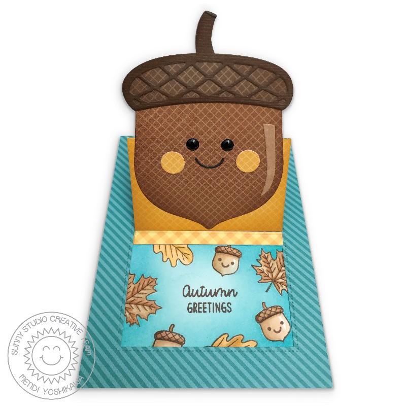 Create layered acorns using this fun 8-piece die set perfect for small shaped cards, embellishments, gift tags, card windows or shaped shakers. For a unique look cut from a variety of materials, with or without the face. Die Measurements: 3" wide x 4" high