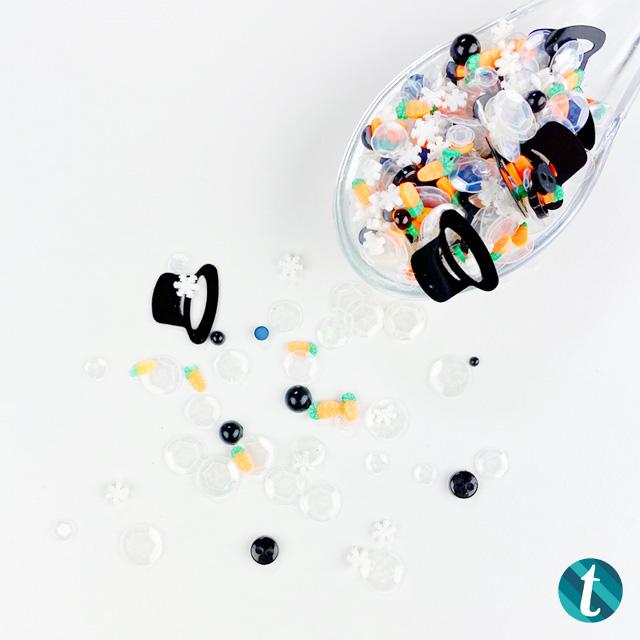 This fun frosty mix of embellishments gives the perfect impression of a melted snowman. In this mix you will find mini black buttons and black flat backed beads, clay carrots, black top hat confetti, and transparent holographic sequin confetti in multiple sizes. Perfect for a shaker card or use the pieces to build your own snowman. approx 1.5 tsp comes packaged in our plastic storage box.
