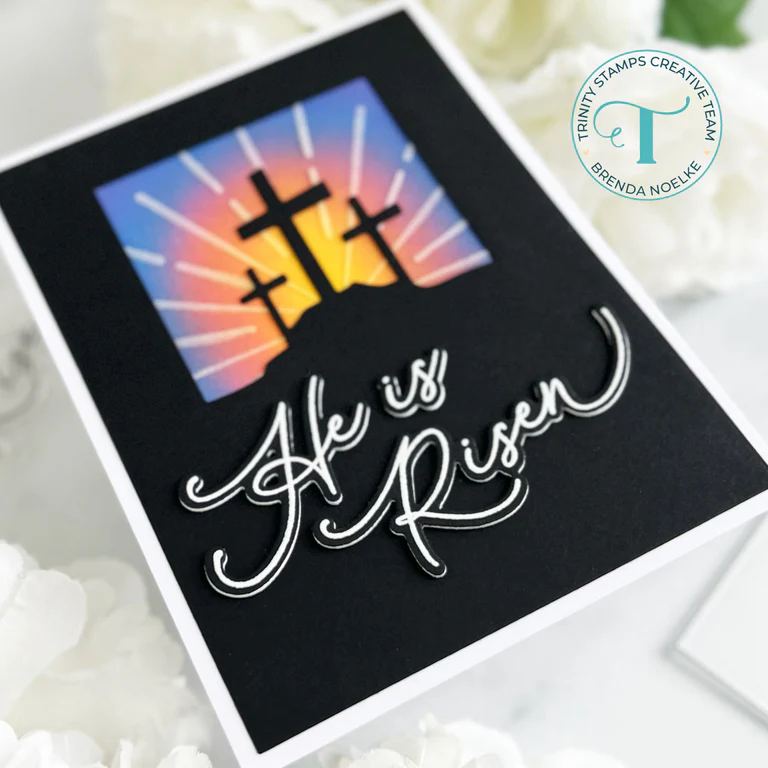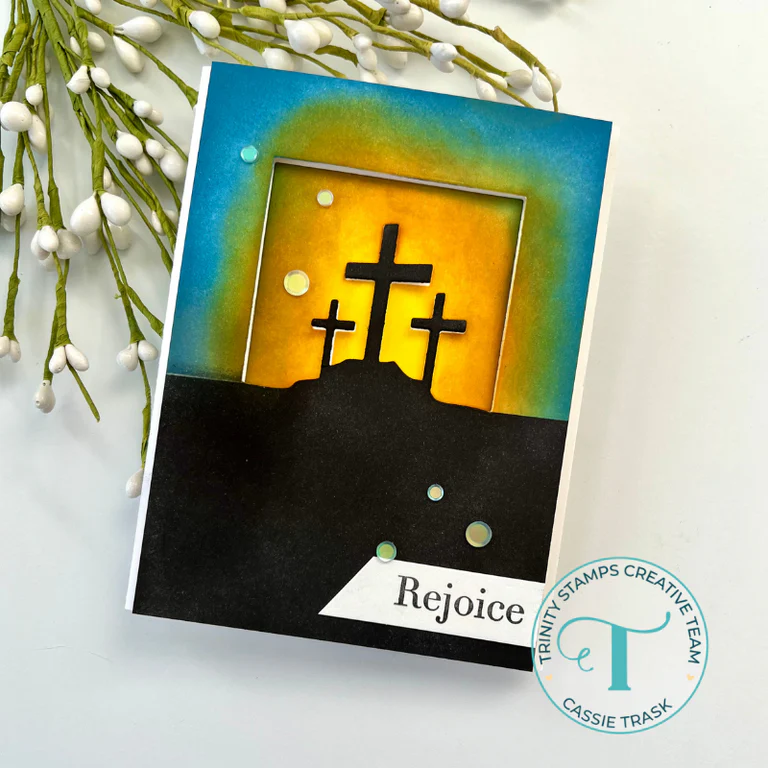 With this cut-out die, you can easily create a scene featuring three crosses within a square window, leaving behind only the negative space. Approximate window size is 2.5 inches.