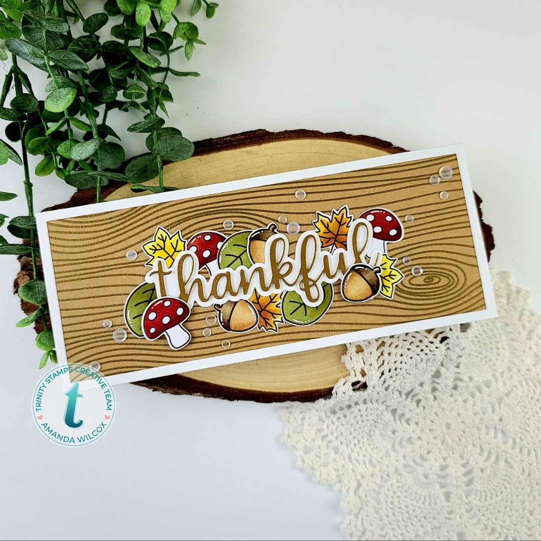 Create a whimsical tree trunk or wood background with this fun background stamp! This 4x11" slimline stamp set features one large slimline hand-drawn wood pattern background stamp that measures 8.25x3.25", as well as 5 supporting images of leaves, a mushroom, and an acorn. (largest leaf, the center rounded one, measures 3.5x2 cm). A coordinating die set is available (sold separately).