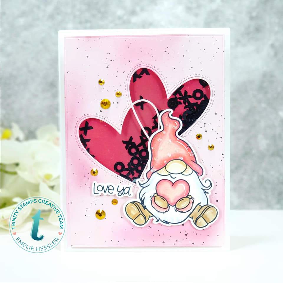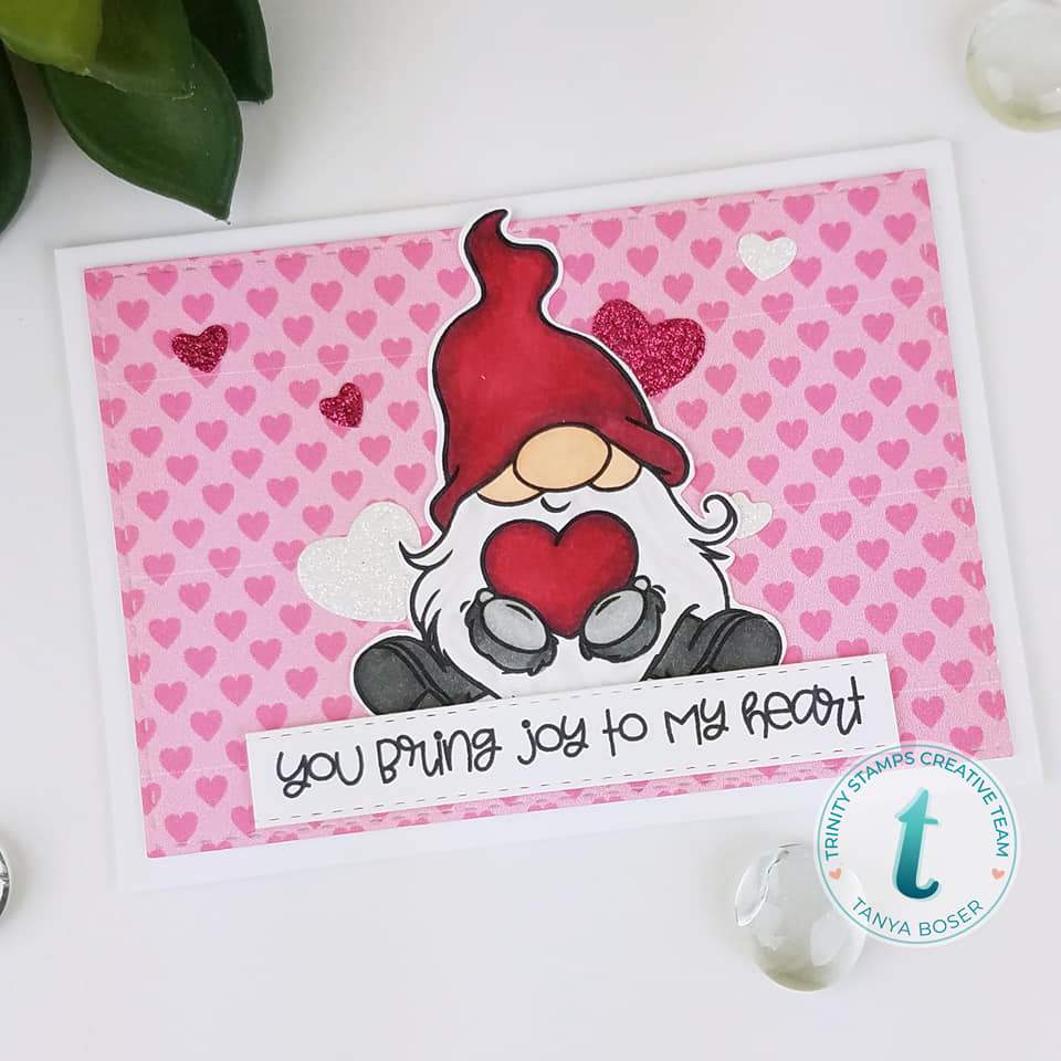 Our Joyful Heart stamp set features 5 stamps in total. One main image of a gnome sitting and holding a heart along with 4 different sentiments. Gnome measures approx. 2.3" x 2.8". A coordinating die set is available (sold separately).