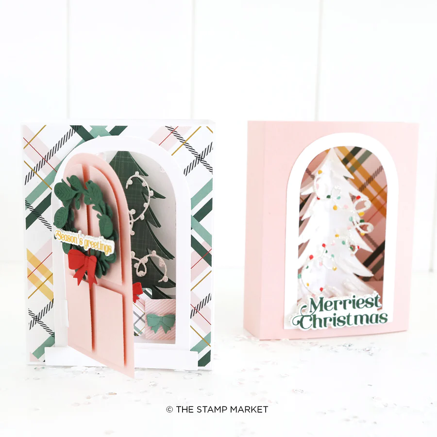 Metal Edge Dies with 11 pieces. A simple layering Door Die that fills a card front and allows you to create an opening to use with shadow box cards or keep it simpler with a simple door on the front of a card. Pair with our Oh Christmas Tree Die & Feels like Christmas Stamps to create a unique interactive Christmas card. What color will you make your Holiday door?