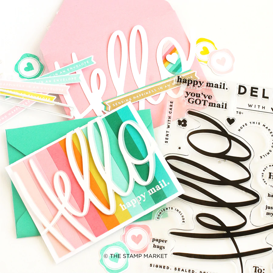 1 6x8 Stamp Set with 19 images. Mix and match many images to create fun elements for your envelopes. The perfect way to add a little extra touch to your cardmaking. The large hello is created to bleed off your envelopes and cards.