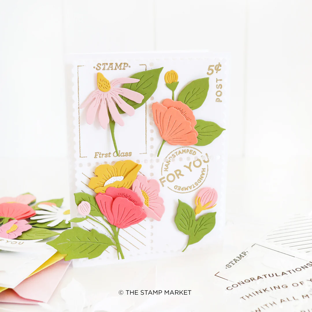 1 4X6 STAMP SET W/ 17 images. Add a unique touch to your cards and envelopes with FIRST CLASS STAMP. This set of stamps features postage words and details, perfect for accenting your mail. Make a statement with every piece of mail you send. Coordinates with our Postage Stamp Cover Die