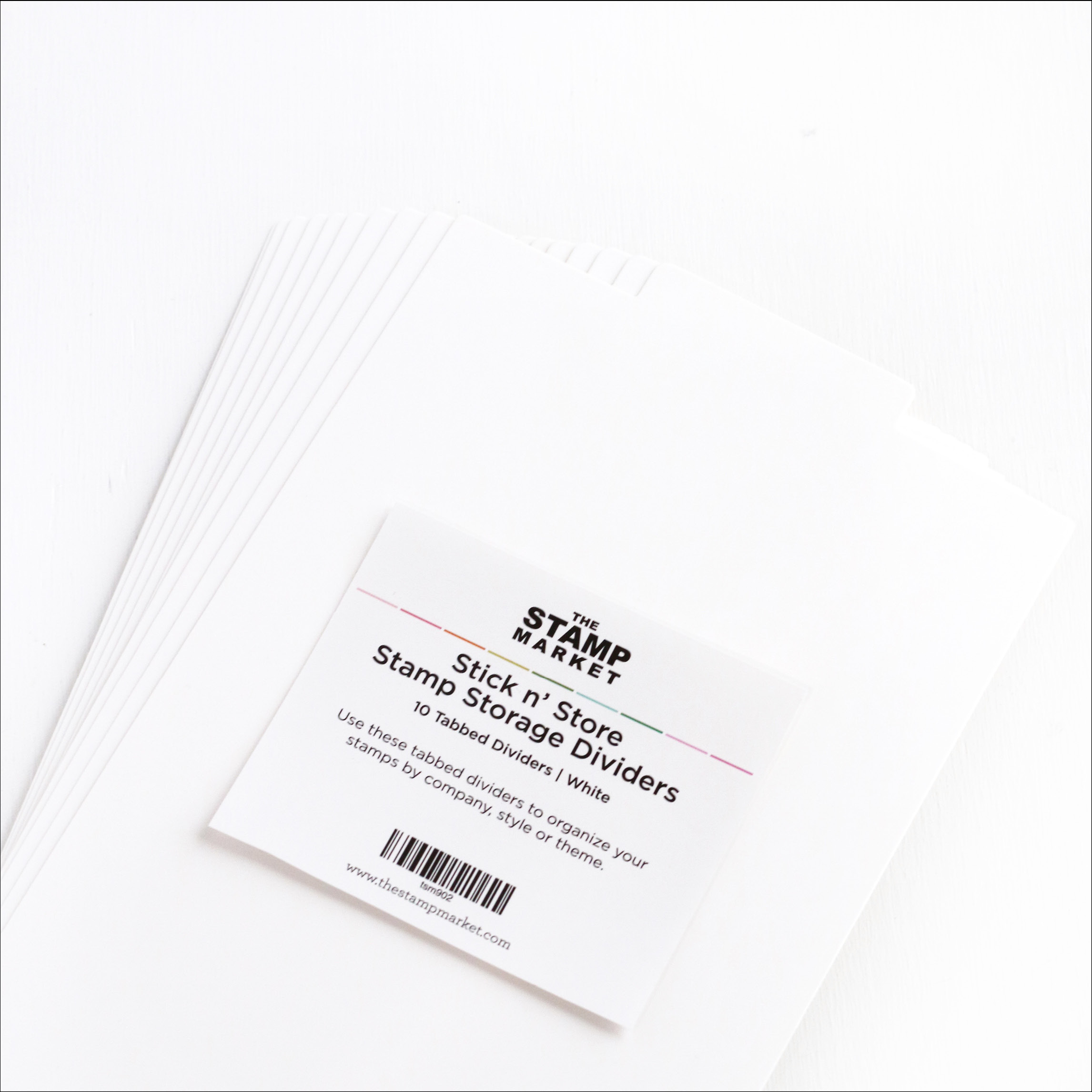 10 Laminated and Diecut Stamp Storage Dividers in white. Use these tabbed dividers to organize your stamps by Company, Theme, Style. Label with our coordinating sticker labels. Sold separately. Dims are 5.5" x 8.5" including tabbed top