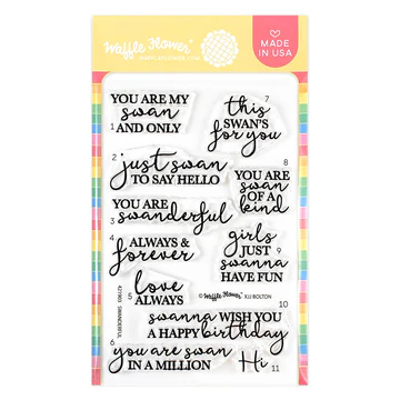 You know you swanna add these swanderful sentiments to your stash! Whether you're saying hello, wishing a happy birthday, or letting someone know they're the 'swan' for you, this charming font pairing has you covered. Each sentiment is numbered on the stamp set and etched on the back of the matching die, making it easy to find the perfect match-stamp with confidence! 4"x 6" set of 11 stamps. Approximate Sizes: "You Are My Swan And Only": 1 9/16" w x 3/4" h, "Just Swan to Say Hello": 2 3/8" w x 7/8" h, "You Are Swan Of A Kind": 1 1/8" w x 7/8" h, "You Are Swanderful": 2 7/16" w x 11/16" h, "Always & Forever": 1 11/16" w x 3/4" h, "Swanna Wish You A Happy..": 2 7/8" w x 7/8" h, "You Are Swan In A Million": 2 1/2" w x 1/2" h, "Hi": 5/8" w x 7/16" h. Coordinates with: Swanderful Matching (Die).