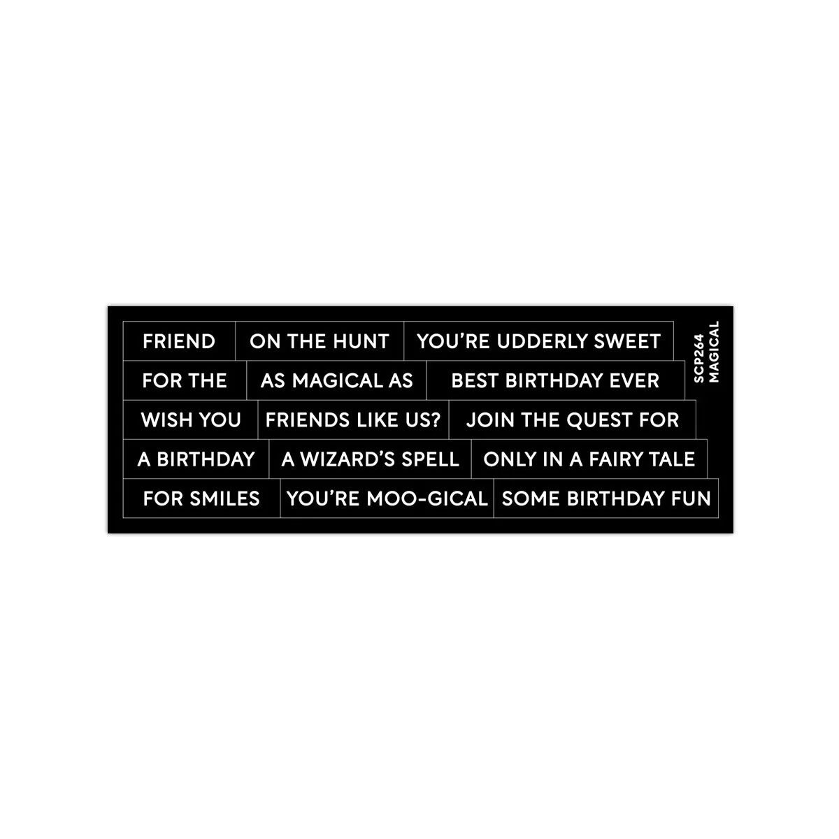 This sheet includes 15 sentiment strips in 1/4" increment in width. Precut - easy tear-off diecut shapes. Each sheet comes in a clear bag for protection and storage. Check out the Subsentiment series for more diecuts. Combinations: YOU'RE UDDERLY SWEET, FRIEND ... YOU'RE MOO-GICAL, FRIENDS LIKE US? ... ONLY IN A FAIRY TALE, JOIN THE QUEST FOR ... SOME BIRTHDAY FUN, ON THE HUNT ... FOR SMILES (FOR THE ... BEST BIRTHDAY EVER), WISH YOU ... A BIRTHDAY ... AS MAGICAL AS ... A WIZARD'S SPELL