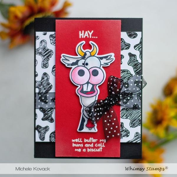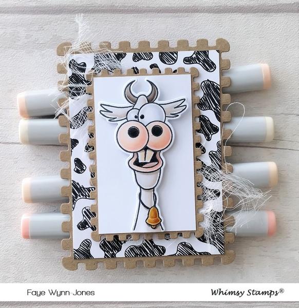 Clearly Whimsy Stamps Collection "Hee Haw" designed by Deb Davis - Amped2Stamp for Whimsy Stamps. Hee Haw includes a 4x3 stamp set with coordinating outline die for the cow image. Silly sentiments coordinate with this goofy cow image to help create some Hee Haw fun. High quality photopolymer clear stamps, use with an acrylic block Approximate size in inches: 4 x 3 polymer sheet. Includes outline die for image.