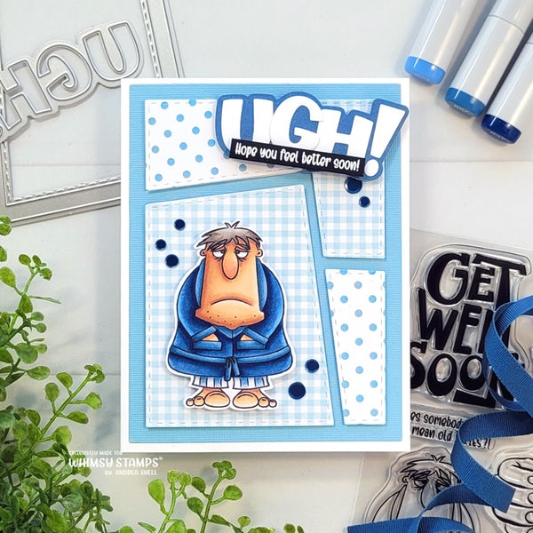Clearly Whimsy Stamps Collection "BooBoo Manflu" clear stamp set designed by Deb Davis - Amped2Stamp - for Whimsy Stamps. A funny get well themed stamp set sure to bring a smile. Goes great with our Slimline Big BooBoo die set (sold separately). High quality photopolymer clear stamps, use with an acrylic block Approximate size in inches: 4 x 6 polymer sheet.