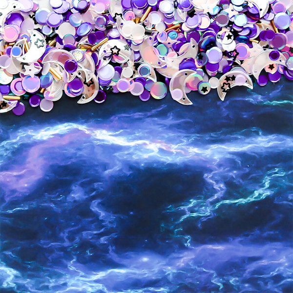 This beautiful mix was specially created by This Calls for Confetti and it's filled with purple confetti, sequins in the shapes of moons, stars, and gold bugle beads and was inspired by the one and only Emma Lynn! It goes well with Whimsy Stamps Slimline Nebula Paper Pack and Whimsy Stamps Slimline Lost In Space Paper Pack. WARNING: CHOKING HAZARD-Small Parts. Not for children under 12 years.