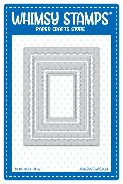 Whimsy Stamps Die Collection "Inverted Scallop Rectangle Die Set" designed by Deb Davis for Whimsy Stamps. This is a set of 4 mix-n-match rectangle shaped dies. Some with straight cut edges and others with inverted scallop detailed edges. Two of them also have a stitching accent detail along the edging. Make shaker cards, use to frame an image or sentiment, create a focal point or just an accent. Largest die fits perfectly on A2 sized cards and the two smallest dies are perfectly sized for ATC's (artist trading cards).