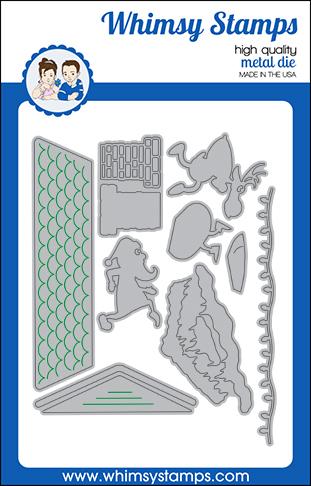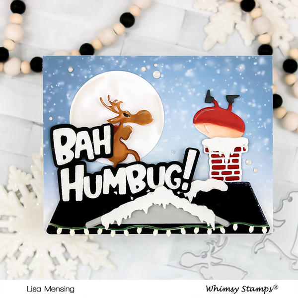 Whimsy Stamps Die Collection "Santa Sneaking Die Set" designed by Denise Lynn and Deb Davis for Whimsy Stamps. This is a set of 10 dies - use these dies to create fun scenes with Santa and Rudolph making their Christmas deliveries. Set includes multiple roof tops, a chimney, snow/icicle trimmings, Christmas lights, and Santa sneaking or sticking out of the chimney and a sneaking Rudolph.