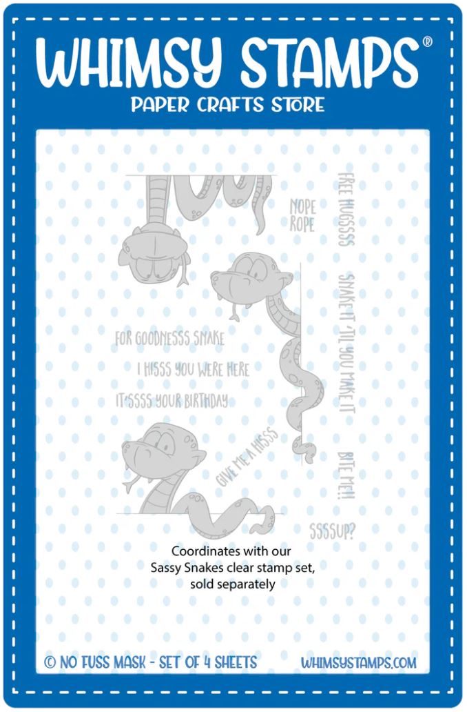 Don't like to FUSSY CUT but love all the super cool looks that can be achieved by the masking technique? Wish you could snap your fingers and have pre-cut masks for your favorite Whimsy stamp sets? Well now you can with the new Whimsy Stamps NoFUSS Masks! Sassy Snakes NoFuss Masks coordinates with our Sassy Snakes clear stamp set, sold separately. Currently available on select Whimsy Stamps clear stamp sets. More to come!