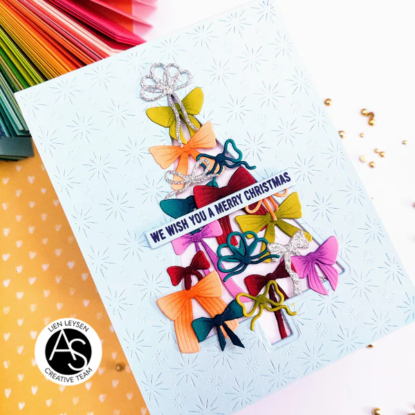 Build-a-Bow Christmas Tree Die Set by Alex Syberia Designs includes 10 dies that let you create a festive Christmas tree entirely from layered bows. This playful and versatile set is perfect for adding a unique touch to your holiday cards, scrapbook pages, gift tags and paper crafting projects. Mix and match different colours and textures to build a truly one-of-a-kind Christmas tree design!
