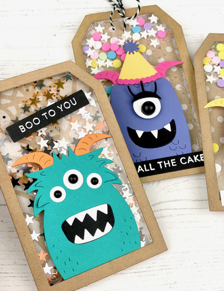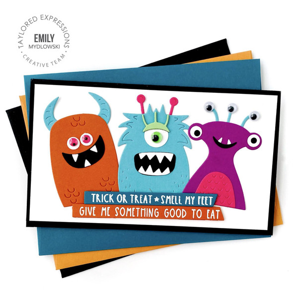 The sky's the limit with TE's Monster Squad! This set includes 3 different monster bodies plus coordinating dies for their eyes, mouth, antenna, or horns. Monster Squad makes adorable Halloween or Birthday cards for any kid or kid-at-heart! These spooky & silly looking monsters are sure to spread joy! Largest monster body measures 1 3/4" x 2 1/4". Smallest monster body measures: 1 1/2" x 2"
