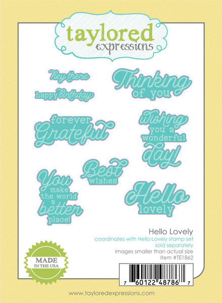 The Hello Lovely Dies coordinate with the Hello Lovely stamp set to perfectly set off your sentiments: You make the world a better place! Hello lovely Best wishes Happy Birthday Hey there Wishing you a wonderful day! Thinking of you Forever grateful Set of 8 individual dies. Smallest sentiment measures 1.5" x.5" and largest sentiment measures 2 ?" x 1.125".
