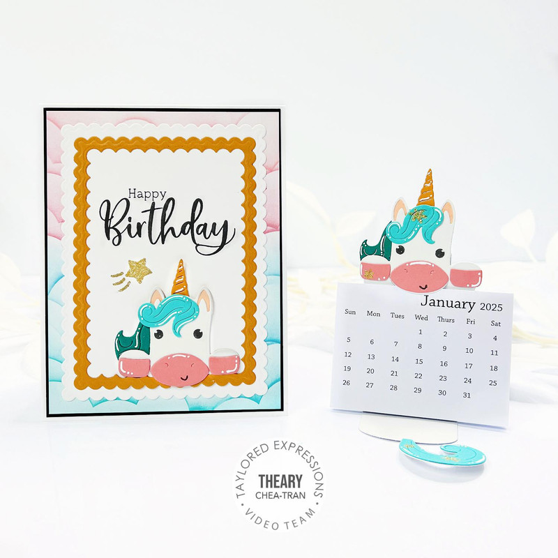 Add a whimsical element to gift cards or mini calendars with this sweet, magical unicorn! Our I'm a Hugger dies are sized to wrap around a gift card envelope, hold a mini-tear off calendar, or to hold onto a placecard at a special birthday party! Unicorn die measures 6" x 2.125" and includes both die and clear stamp accessories.