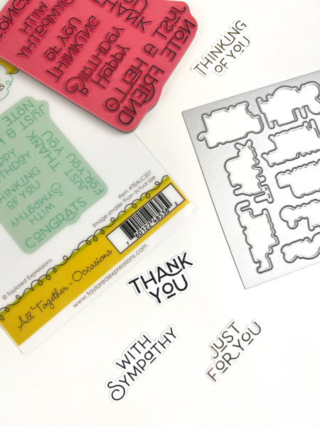 Our popular All Together Collection makes stamping & die cutting a breeze by allowing you to stamp and die cut all of the sentiments at once! One large stamp includes 8 greetings while the coordinating All Together - Occasions die cuts them all out in one pass through your die cutting machine. Sentiments include: Congrats, With sympathy, Thinking of you, Happy Birthday, Hello friend, Just a note, Thank you, Just for you. Single image pre-trimmed red rubber stamp mounted on cling foam. Measures 2.75" x 3.25". Smallest sentiment measures: 1.75" x 0.375", Largest sentiment measures: 0.625" x 1.5".