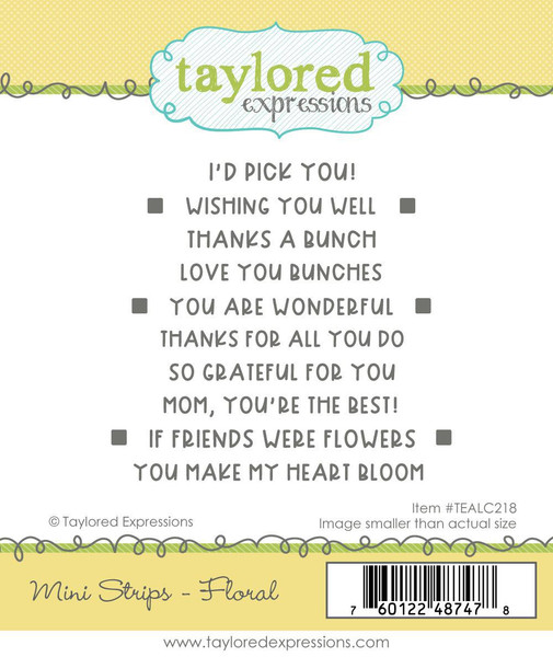 Mini Strips - Floral coordinates with any of our Mini Strips Dies to create 10 sentiment strips that have been perfectly picked to compliment any floral card you create! Use these sayings individually or layer them together: You make my heart bloom Wishing you well Thanks a bunch Love you bunches You are wonderful Thanks for all you do So grateful for you Mom, you're the best! If friends were flowers I'd pick you! Single image pre-trimmed red rubber stamp mounted on cling foam. Measures 3 3/8" square.