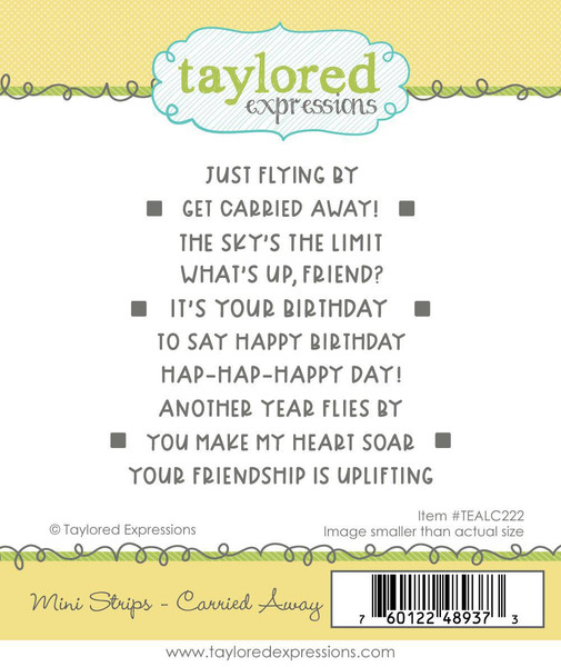 Mini Strips - Carried Away coordinates with any of our Mini Strips Dies to create 10 sentiment strips that have been perfectly picked to compliment any card you create! Use these sayings individually or layer them together: Just Flying By, Get Carried Away! The Sky's The Limit, What's Up, Friend? It's Your Birthday, To Say Happy Birthday, Hap-Hap-Happy Day! Another Year Flies By, You Make My Heart Soar, Your Friendship Is Uplifting. Single image pre-trimmed red rubber stamp mounted on cling foam. Measures 3 3/8" square.