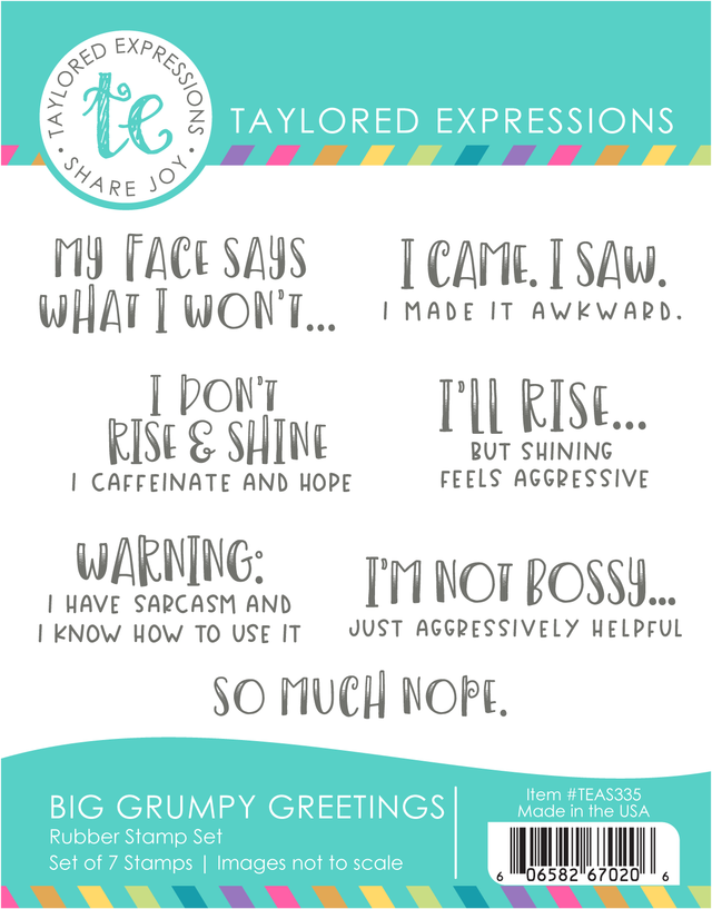 Bring the sass with the Big Grumpy Greeting Stamp Set! These snarky sentiments are the perfect match for our Big Grumpy collection. Just ink them up with your favorite TE Premium Ink to add a dose of humor to your cards and crafts. Sentiments include: My face says what I won't..., I came. I saw. I made it awkward. I don't rise & shine. I caffeinate and hope, I'll rise... but shining feels aggressive, Warning: I have sarcasm and I know how to use it, I'm not bossy... just aggressively helpful, So much nope. Includes 7 pre-trimmed red rubber stamps on cling foam. The largest measures 2 1/2 x 3/4 in. and the smallest measures 2 1/4 x 1/2 in. Storage panel measures 4 1/2 x 5 3/4 in. Pairs with the Big Grumpy Stamp & Die Combo and Big Grumpy - Cat Stamp & Die Combo (both sold separately).