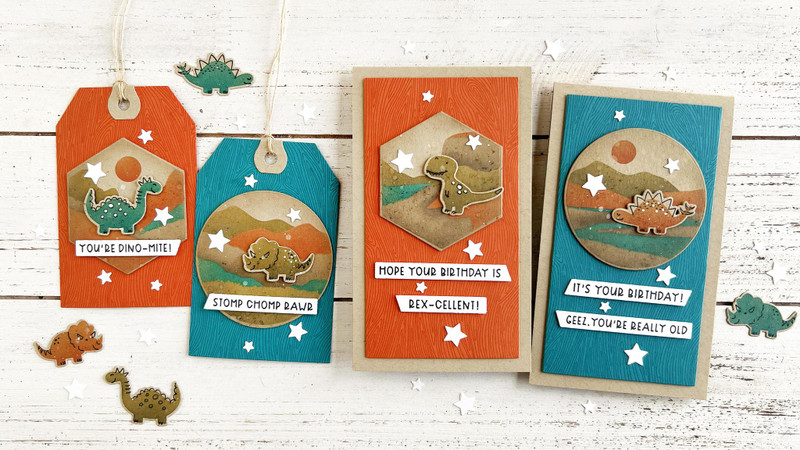 Make your birthday cards rawr-some with the Dino-Mite Stamp & Stencil Combo! Simply stamp the dinosaur details and then choose your favorite TE colors to blend over the dinosaur bodies, using the alignment guides for flawless results! Once you have created your dinos, use the Dino-Mite Cutting Plate (sold separately) to cut them out in a most rex-cellent way! Single image pre-trimmed red rubber stamp mounted on cling foam (measures 4.5" x 6") and 3 stencils that measure 6" x 6".