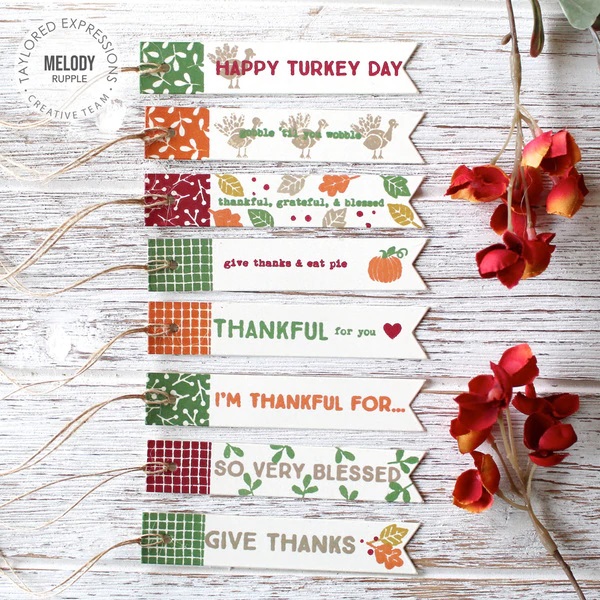 Make fun and festive Thanksgiving gift tags, cards and crafts with our Tag Team - Thanksgiving clear stamp set. This set includes stamps of leaves and berries, a pumpkin, a heart, an acorn and a turkey, as well as patterned squares and lots of seasonal sentiments. Coordinates well with our Tag Team - Alpha stamp set and Tag Team Dies (sold separately). Set of 24 clear photopolymer stamps. Comes packaged on a 4" x 6" clear folder for easy storage.