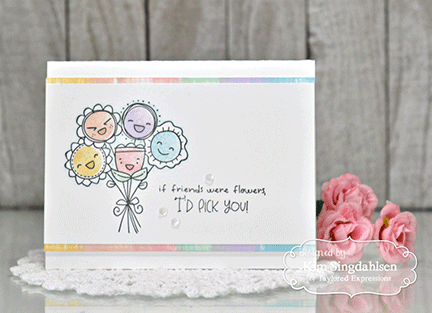 The Inky Fingers - Flowers stamp set has everything you need to create adorable cards for family and friends except one thing: your fingerprints! Ink up your finger or thumb and press it on a card or other craft before using these stamps to turn those prints into flowers! Use them in a row or as a bouquet with fun sentiments, including: Happy bloomin' birthday, Sending smiles, Happy Mother's Day, You're the best, Mom, If friends were flowers, I'd pick you, Love you bunches. Set of eight red rubber cling stamps mounted on foam. Comes on a 4.5" x 6.5" storage panel with a color-printed index.