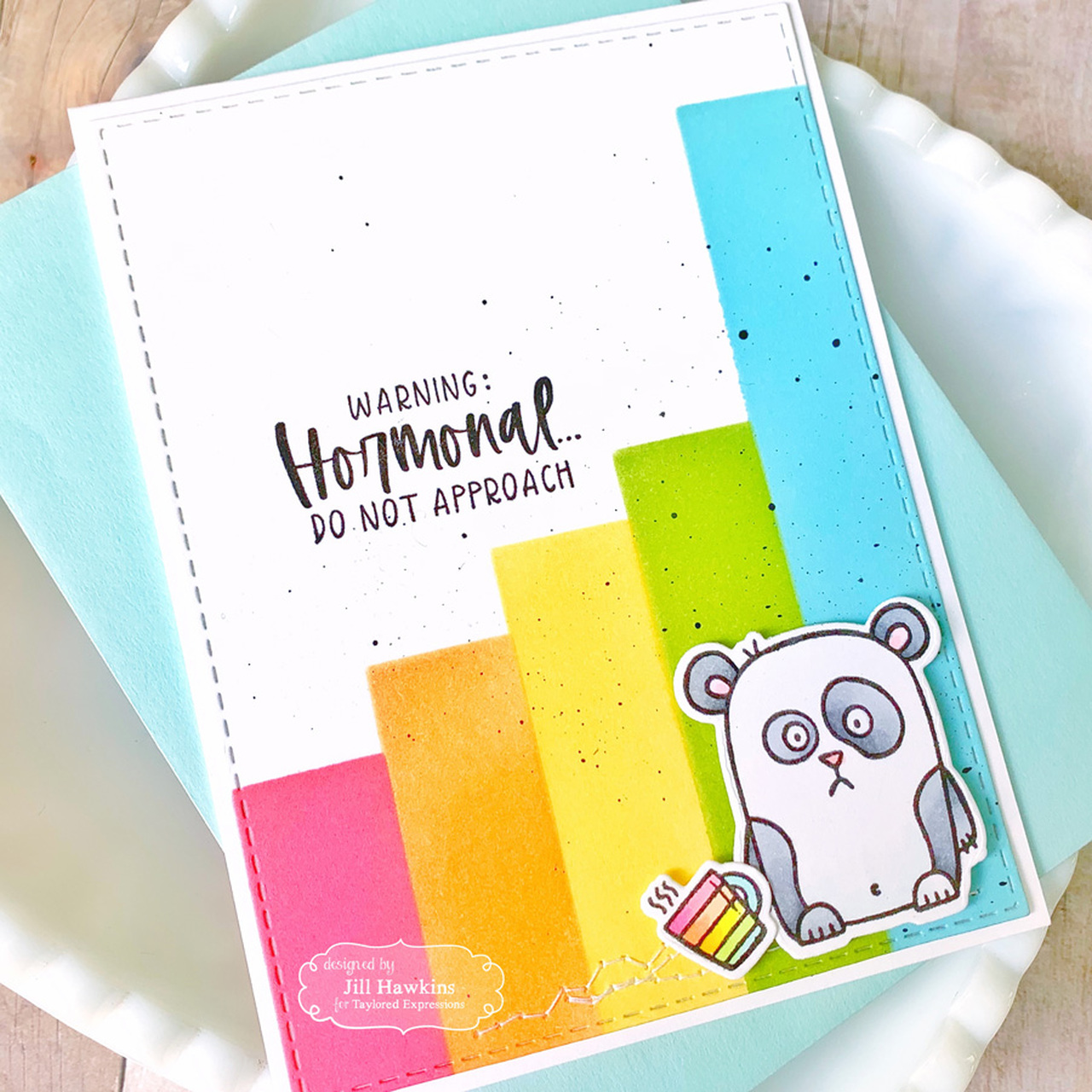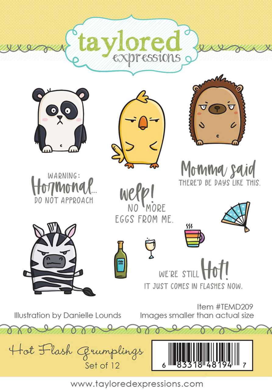 Let's face it - the hormonal roller coaster that is menopause is no laughing matter... unless you can celebrate it with the snarky humor of our Hot Flash Grumplings! Featuring stamps of an emotionally-fraught panda, chick, hedgehog and zebra, along with a few coping mechanisms (wine, coffee and a fan), this set also includes several fun and funny sentiments that perfectly sum up The Change. Set of 12 red rubber cling stamps mounted on foam. Comes on a 4 1/2" x 6 1/2" square storage panel with a color-printed index.
