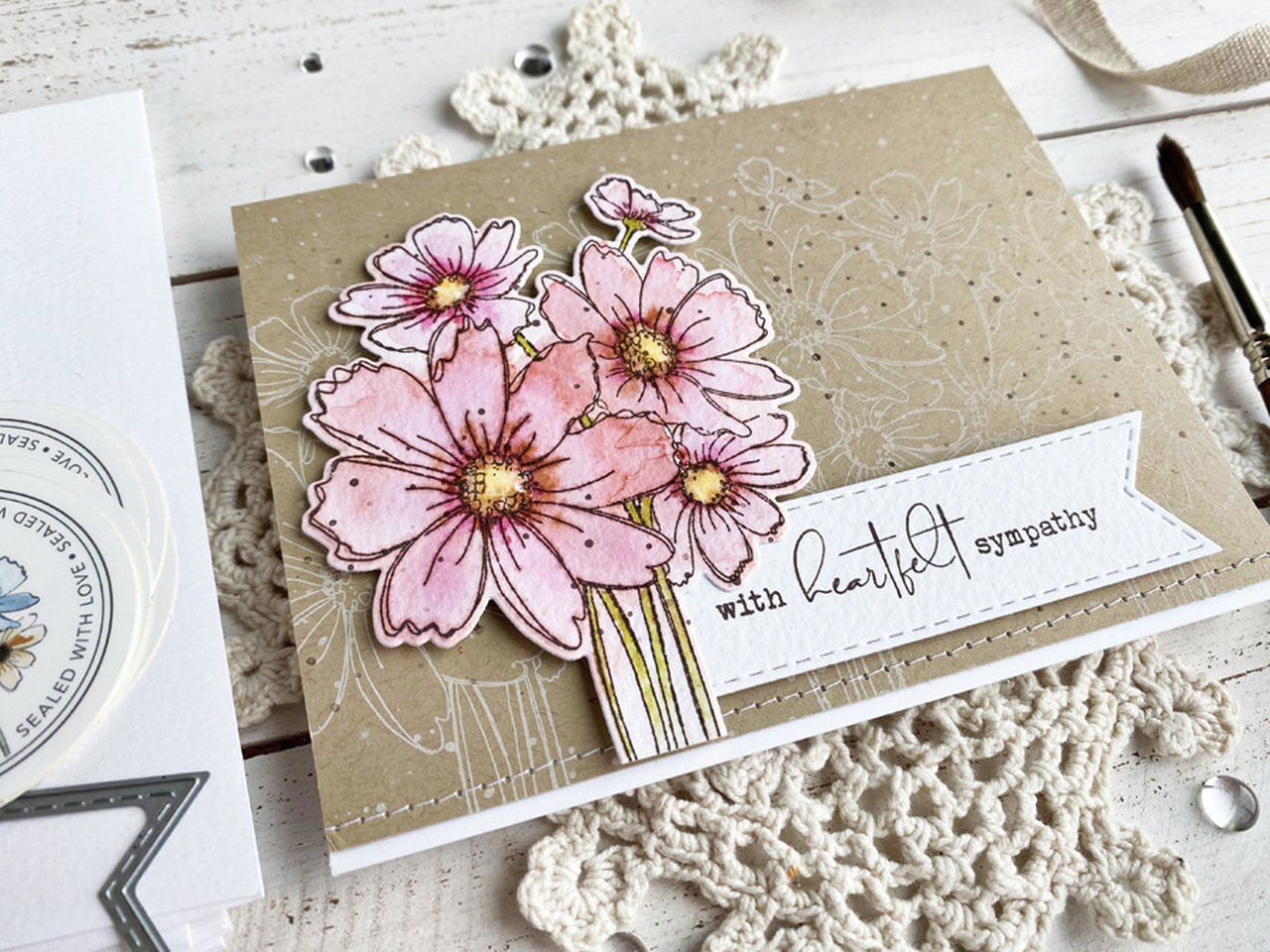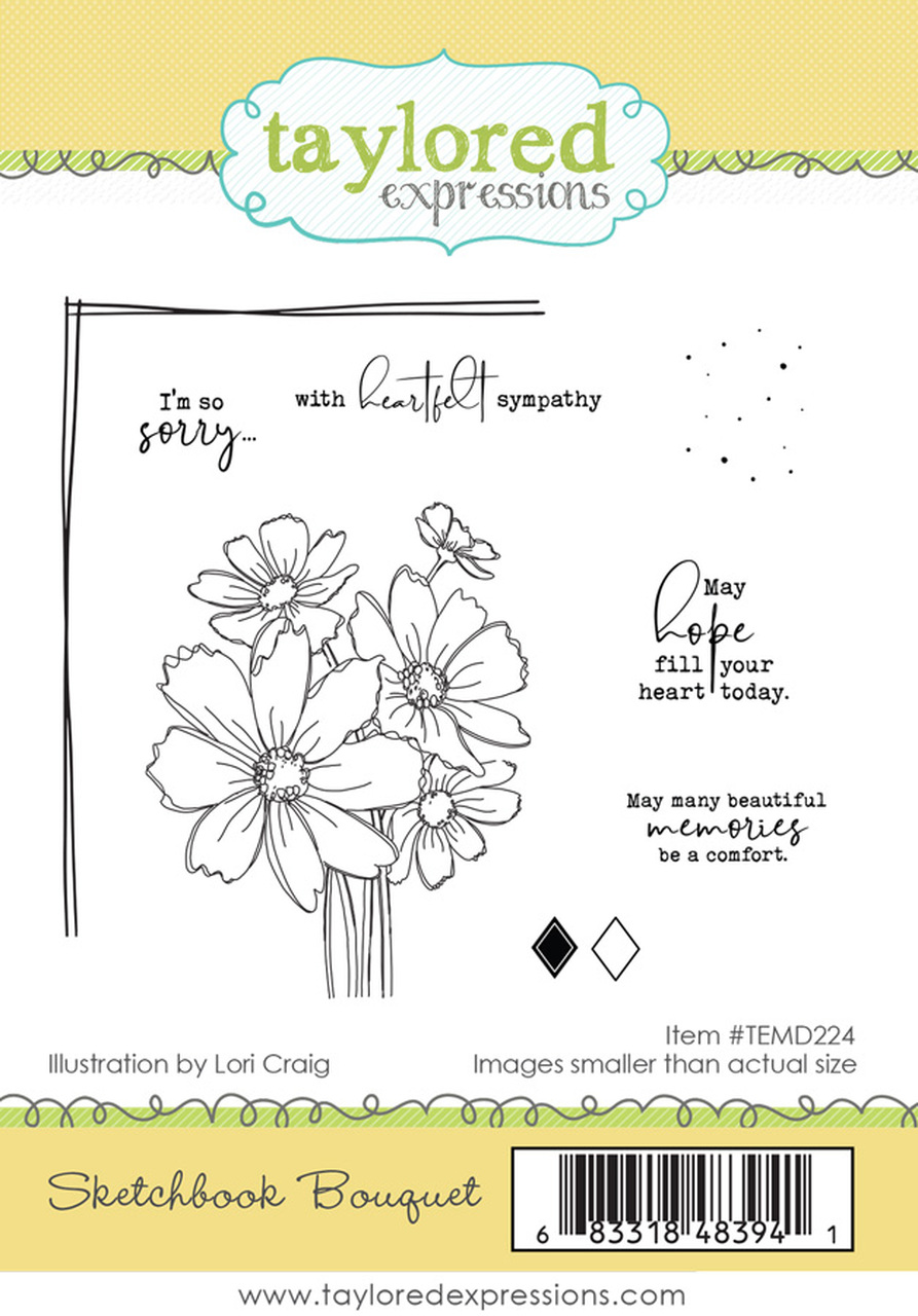 Originally released as part of our Field Notes 2 Cardmaking Kit, the Sketchbook Bouquet stamp set is a beautiful way to express your heartfelt sympathy. Featuring a large bouquet of wildflowers illustrated by Lori Craig, the set also includes some hand-drawn accents and four lovely sentiments: I'm so sorry..., With heartfelt sympathy, May hope fill your heart today, May many beautiful memories be a comfort. Set of 8 red rubber cling stamps mounted on foam. Comes on a 4 1/2" x 6 1/2" storage panel with a color-printed index.