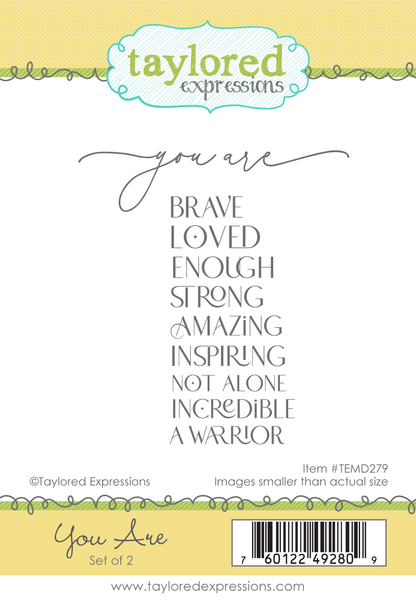 You Are is an encouraging and inspiring stamp set sure to brighten your card recipient's day! This set includes two stamps that work in conjunction to create cards that will uplift & inspire friends & family through a long-term illness or difficult time. First use the large card front sized "You are", then pair it with the statement that best suits your recipient! Or, consider using our TE Masking Paper to stamp only a few of your favorite words. Use this set on its own or with the You Are Dies (sold separately) to cut out each individual word with one pass through your die cutting machine to create your own unique design. Sentiments include: You Are, Brave, Loved, Enough, Strong, Amazing, Inspiring, Not Alone, Incredible, A Warrior. Set of 2 red rubber cling stamps mounted on foam. You Are measures 5" x 1.25"