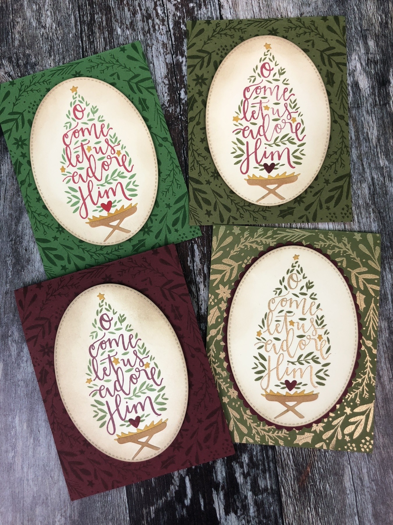 Create the perfect Christmas card or paper craft project using the Let Us Adore him stamp set. Includes 4 stamps to build a Christmas tree with the gorgeous hand lettered sentiment "O come let us adore him" enmeshed within the branches. Christmas tree image is set atop a simple manger illustration. Merry Christmas sentiment stamp also included.