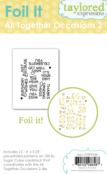 Foil It - All Together Occasions 2 adds a polished sentiment to your cards! Designed in a versatile font, you'll find yourself using these sentiments year round. The sentiments coordinate with the All Together - Occasions 2 die(sold separately). Sentiments include: Birthday Wishes, Just Because, Miss You, Love You, Wish Big, Thanks, Sending Hugs, It's Your Day, Get Well Soon, Celebrate You. Set of 12 pre-printed panels on TE Premium Cardstock. Panels measure 4" x 5 1/4". Please note: Our Foil It products are designed to work with a Minc or laminator. They are not compatible with the Spellbinders Glimmer Machine (or other similar hot foiling products).