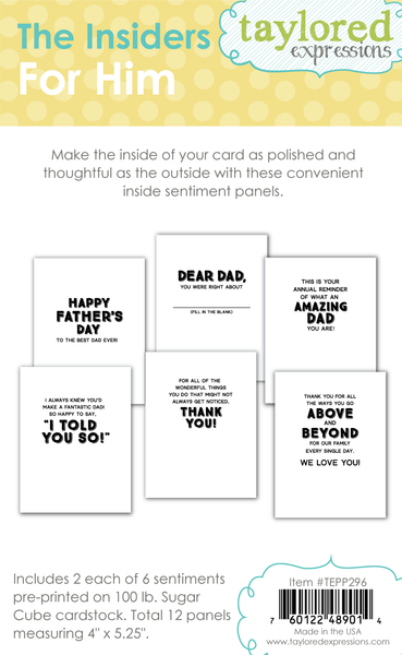 TE's Insiders- For Him is a set of pre-printed sentiments designed to place on the inside of your cards! These panels are trimmed to size and ready to insert into your finished card so all you need to do is simply sign, seal, & deliver! Sentiments included in The Insiders- For Him: Happy Father's Day to the best dad ever! Dear Dad, You were right about (Fill In The Blank!), This Is Your Annual Reminder Of What An Amazing Dad You Are! I Always Knew You'd Make A Fantastic Dad, So Happy To Say, "I Told You So!", For All Of The Wonderful Things You Do That Might Not Always Get Noticed, Thank You! Thank You For All The Ways You Go Above and Beyond For Our Family Every Single Day. We Love You! Includes (12) 4" x 5.25" pre-printed panels on 100lb Sugar Cube Cardstock (2 each of 6 sentiments).